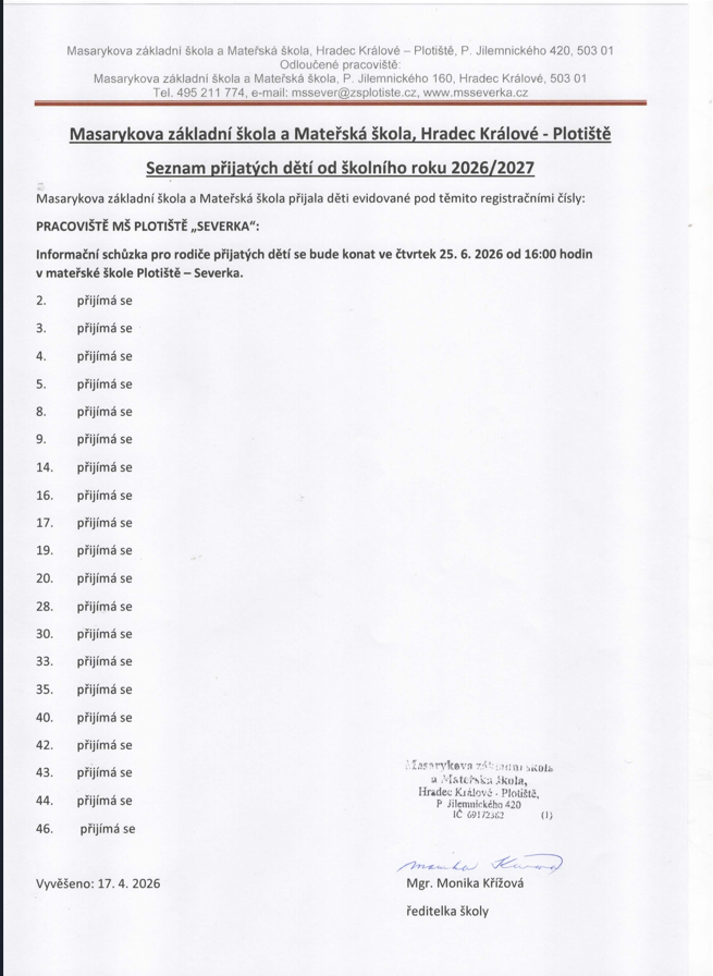 Potvrzení o očkování nemusí předkládat zákonní zástupci dětí, které se do MŠ hlásí k povinnému předškolnímu vzdělávání. - Oznámení o individuálním vzdělávání dítěte dokládá zákonný zástupce pouze tehdy, rozhodne-li se pro individuální vzdělávání svého dítěte (bez pravidelné docházky do MŠ).